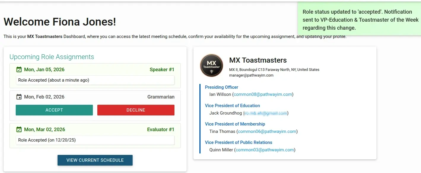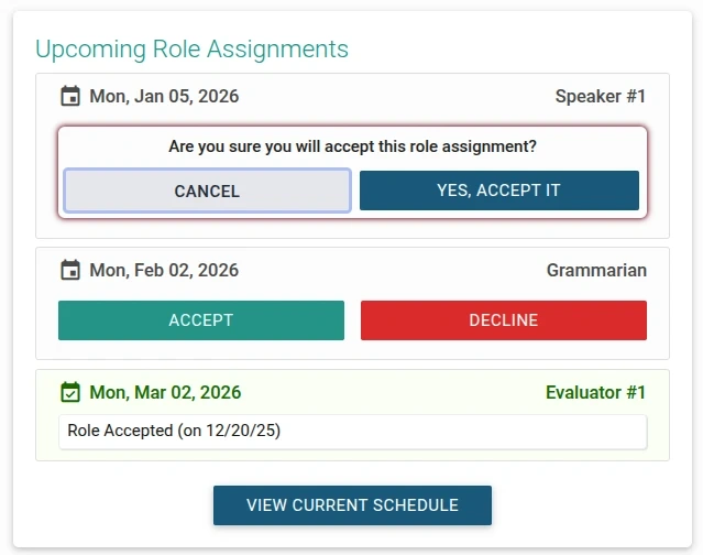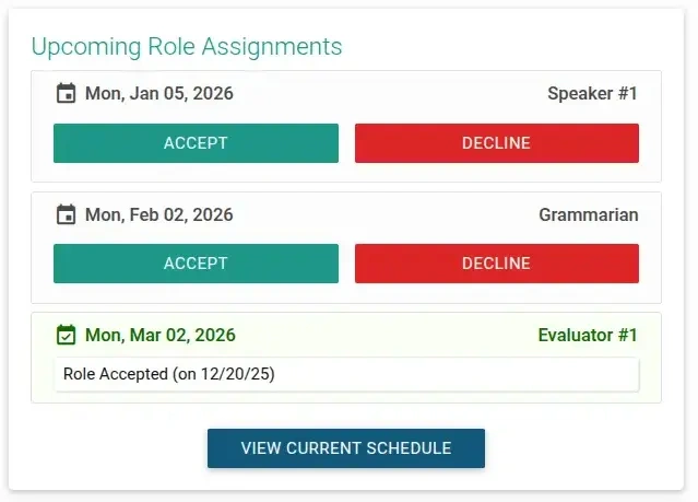 When you're scheduled to fill roles in upcoming meetings, you can easily confirm your availability in TMClubSchedule. You have two convenient options to accept or decline your assigned roles: