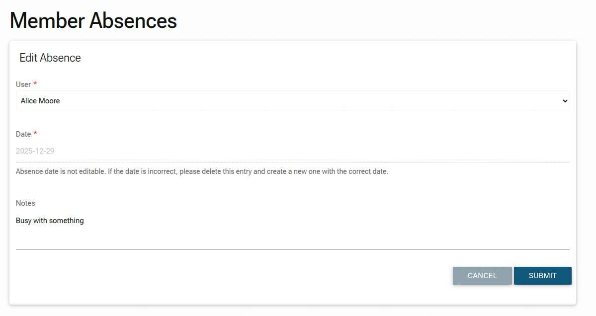 This view provide list of member absences: member's name, the date they will be away, and an optional reason (e.g., "Personal matters" or "Busy with something").