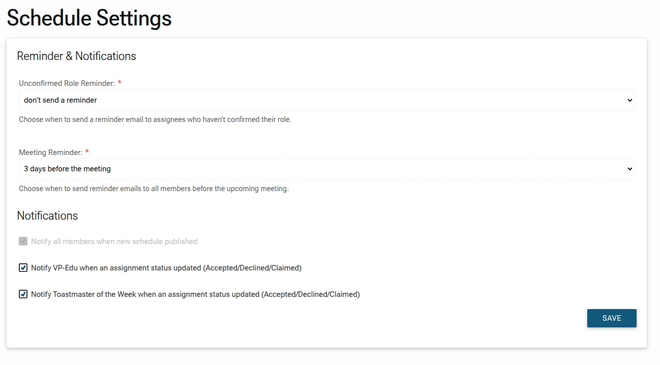 To ensure high meeting attendance and role fulfillment, use the Reminder & Notifications settings to automate communications with your members. These settings help keep role assignees accountable and the entire club informed about upcoming events.